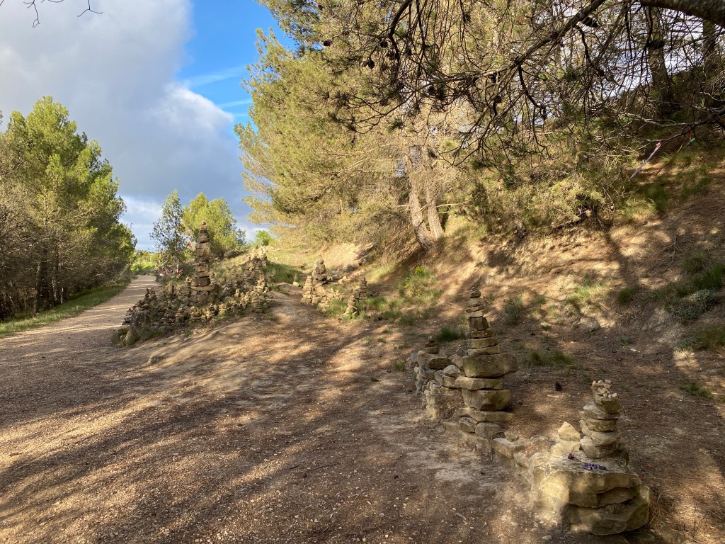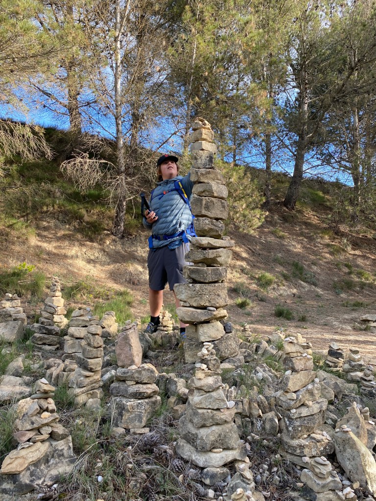We climb steeply out of Torres del Rio and up onto a plateau. There is a strange little garden of cairns that we happily add to.
