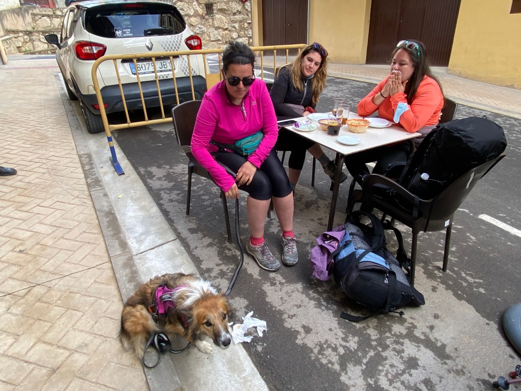 Today James was like a toro, a bull. He powered up hills and across the flat. I struggled to keep up. We fuelled ourselves with bananas and apples and bocadillos, rolls with omelette, cheese and jamón. As the morning was turning, we made it to Viana for a cold cerveza as more pilgrims came into town. On the table next to us was Luna, the dogegrino we saw yesterday.