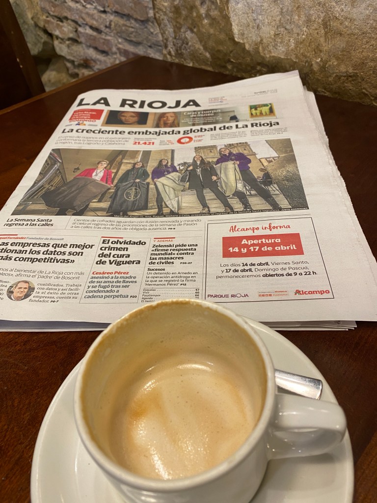 From Navarrete, we powered on for 7.5 km to Ventosa with the promise of a fine La Rioja with lunch. Sadly, the main restaurant was closed and so we had to contend with the pilgrim cafe. It was busy this Sunday afternoon as pilgrims came into town hungry and thirsty after 20km of walking. We enjoyed a vino blanco with Mikael, Mads, Joe and Peter.
