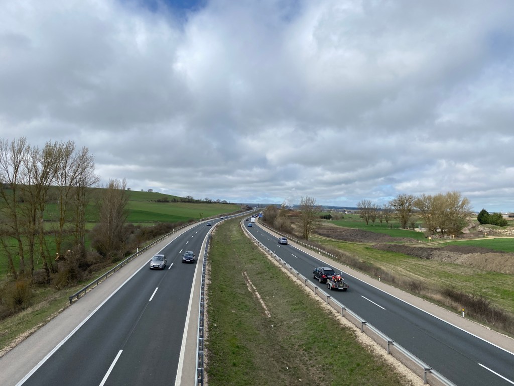 Whilst the signs point for us to go straight ahead, continuing on the road, my guidebook has another route. It means we walk on a gravel track around the edge of the Burgos airport. For the hour or so we walk the perimeter, we see one small plane land. We’re a little surprised that the airport isn’t much busier. We’re glad that we took this route and not the busy road.
