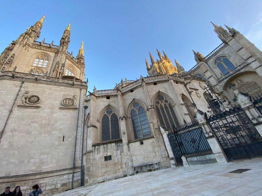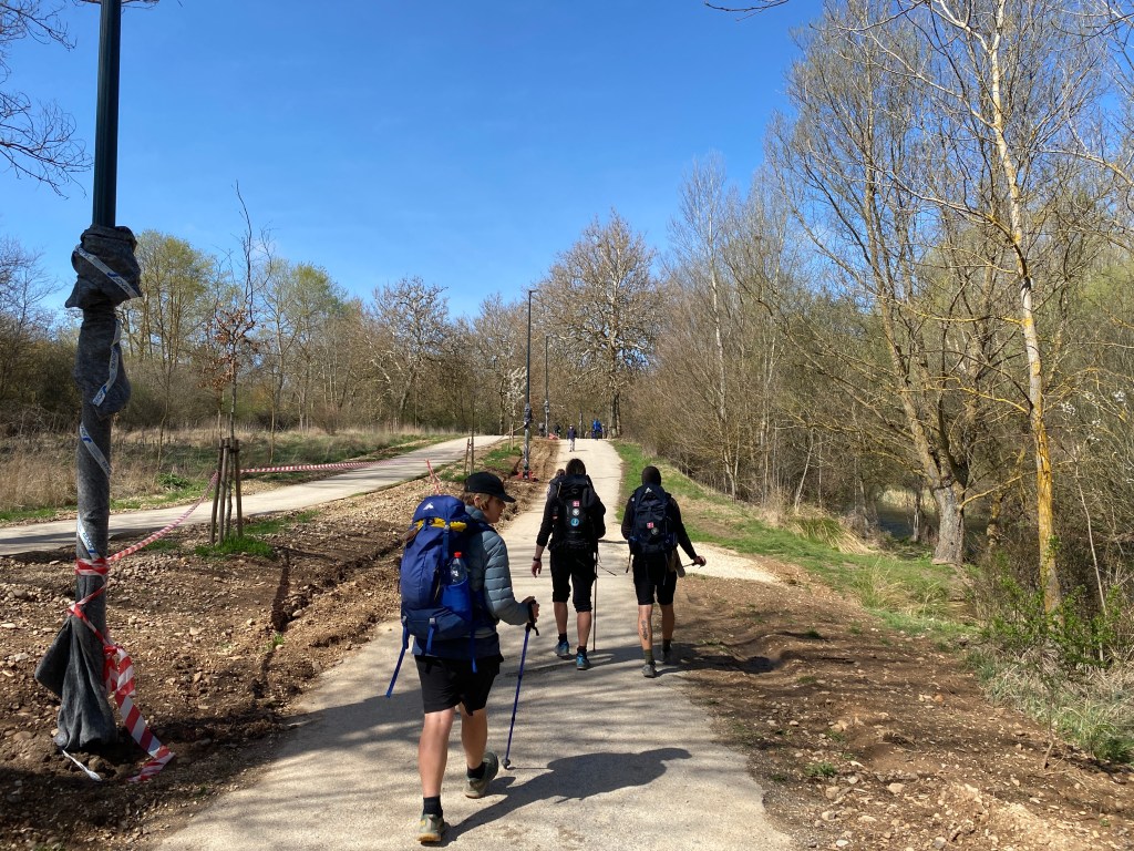 The guidebook also has another ace up it’s sleeve when we hit the main road, ignore the signs once more and follow the Rio Arlanzon (river) into the city. The path is initially a slim dirt track through scrub. The closer we get to the city, the better the path gets and the busier. The fog has been burnt off and we walk in beautiful sunshine.
