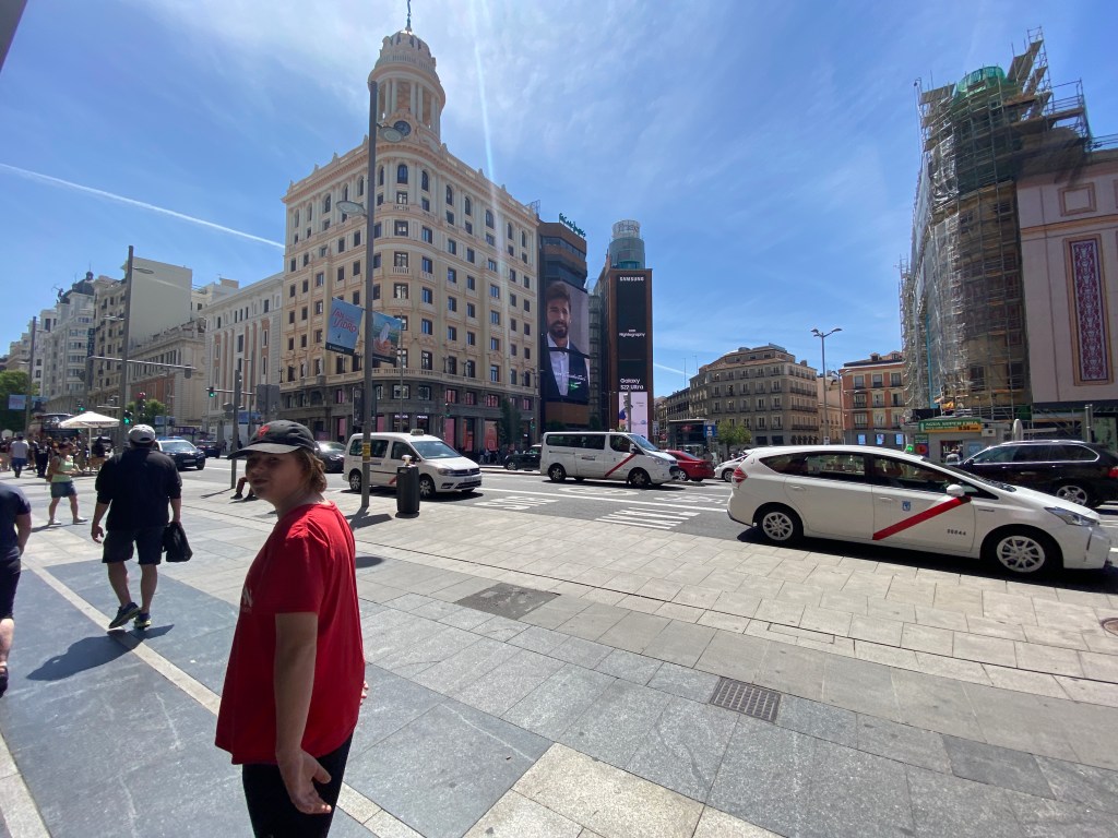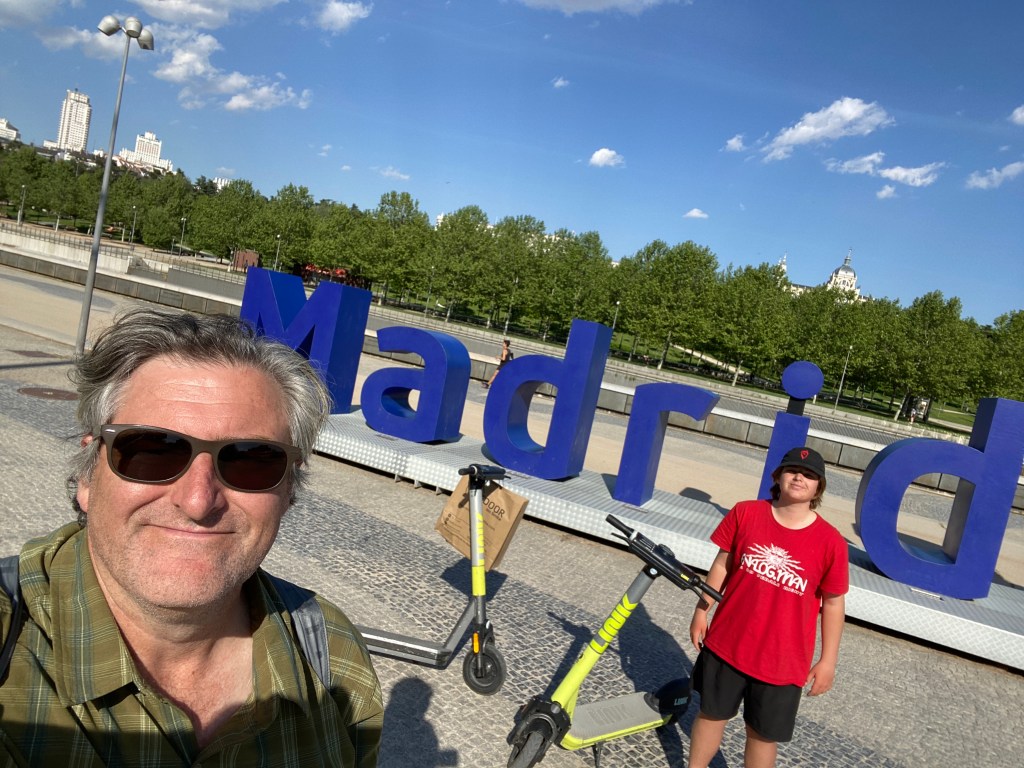 James was quick to spot the electro scooters that were able to be hired. We jumped on and headed into the traffic of Madrid.